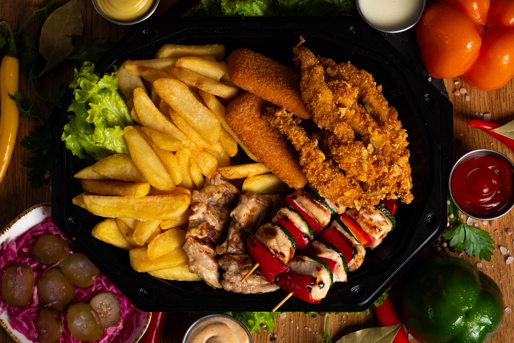 crispy 200gr,frigarui pui 200gr,pulpe dezosate 200gr,cascaval pane 200gr, cartofi prajiti,sos -